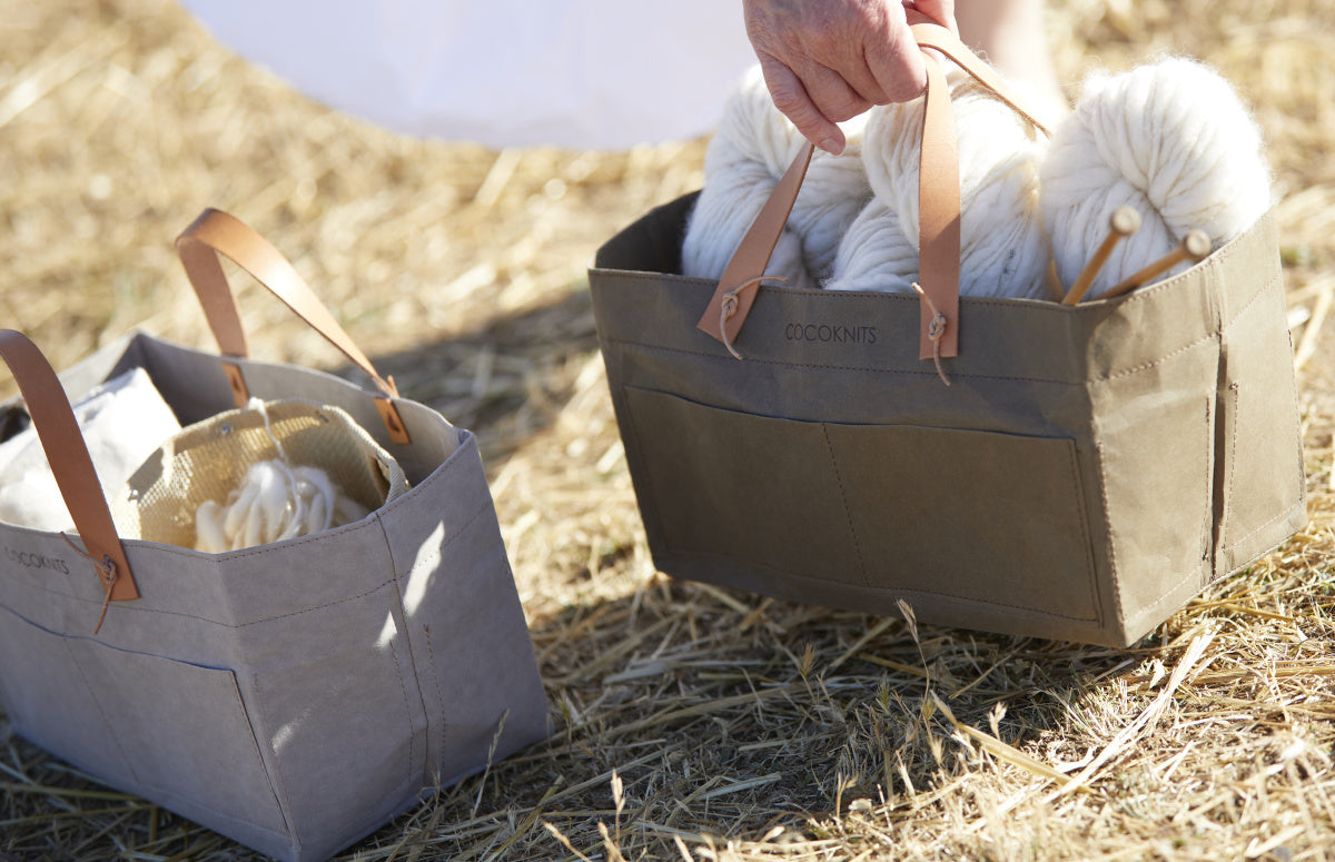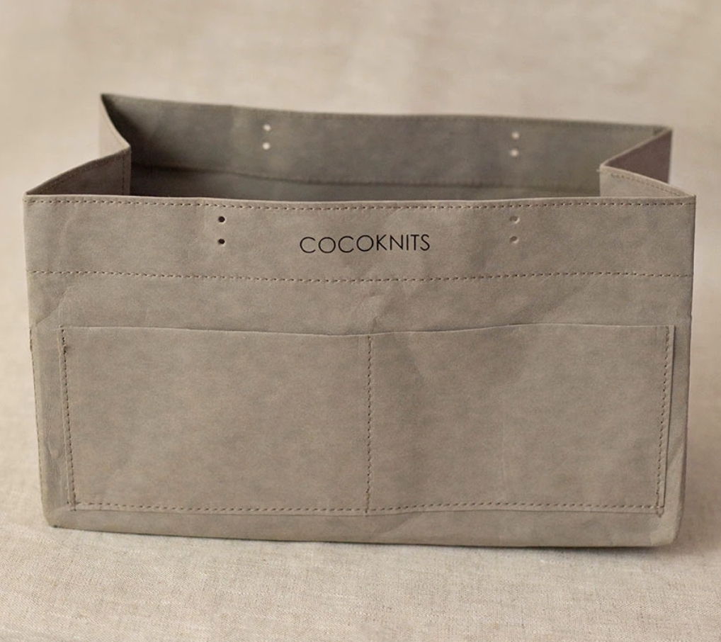 Do you need an attractive ways to contain and organize your stuff, from knitting tools left behind to wherever you were last knitting. Cocoknits washable kraft fabric used for their Accessory Roll and Project Portfolio is the perfect material - stiff enough to sit upright, but also washable (raise your hand if you’ve ever spilled an entire coffee into a tote bag?). The Kraft Caddy is designed with as many pockets as possible - on the inside and the outside. The center is wide open for bigger items like knitting projects, lunch and a water bottle, a rolled-up sweater for travel - and the whole thing fits right down inside a tote. Keep it on a shelf or desk as a storage bin without handles, or add the short, wide leather handles (sold separately) so you can grab it for travel. We all need one of these!