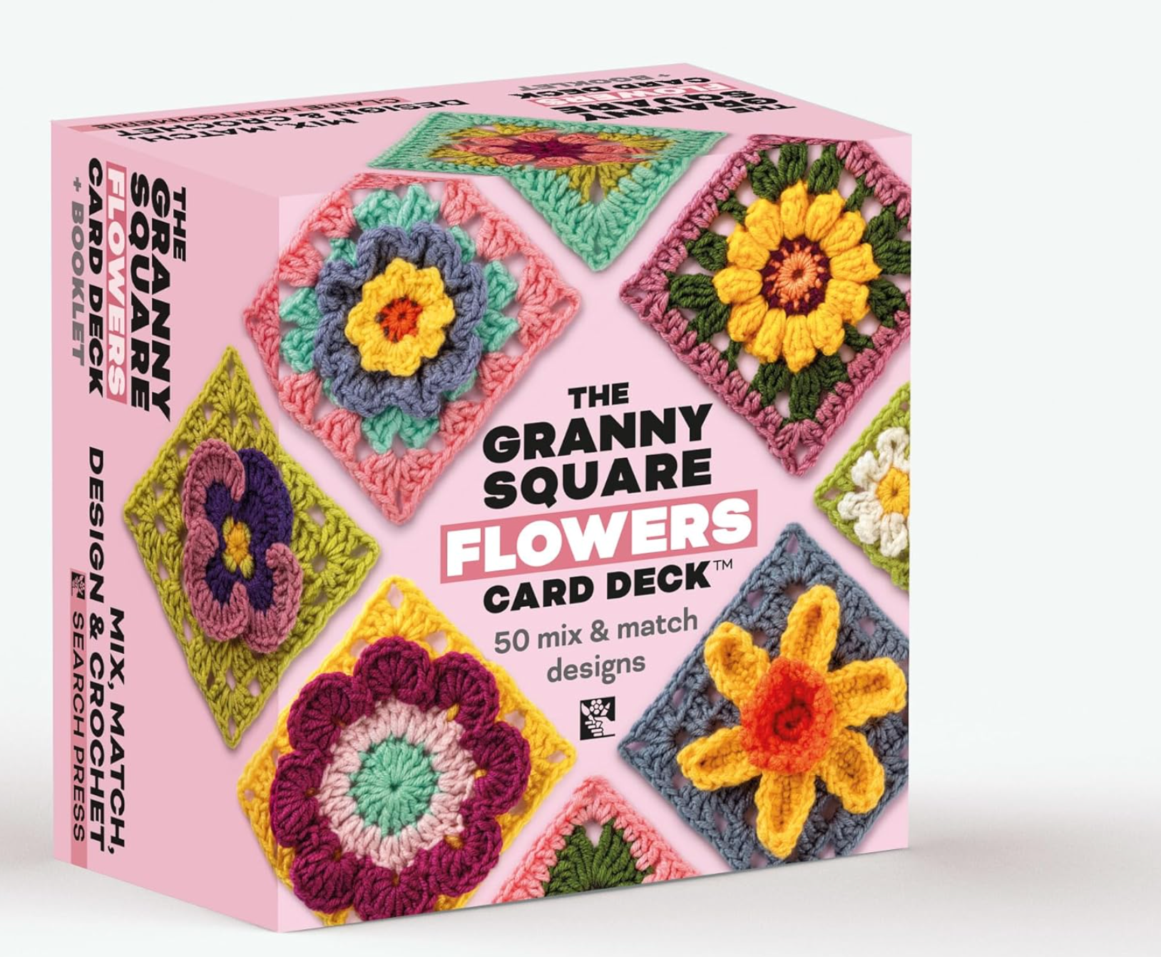 50 fun floral granny square designs in a stylish card deck, perfect for on-the-go crochet.