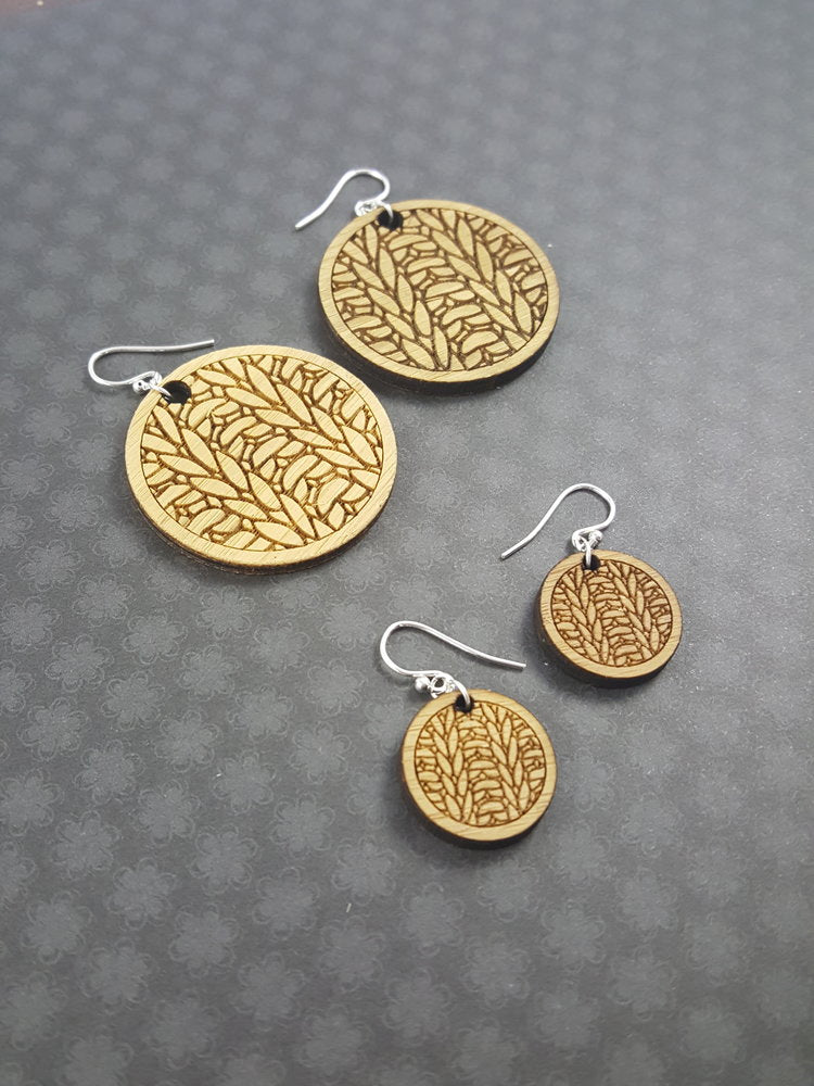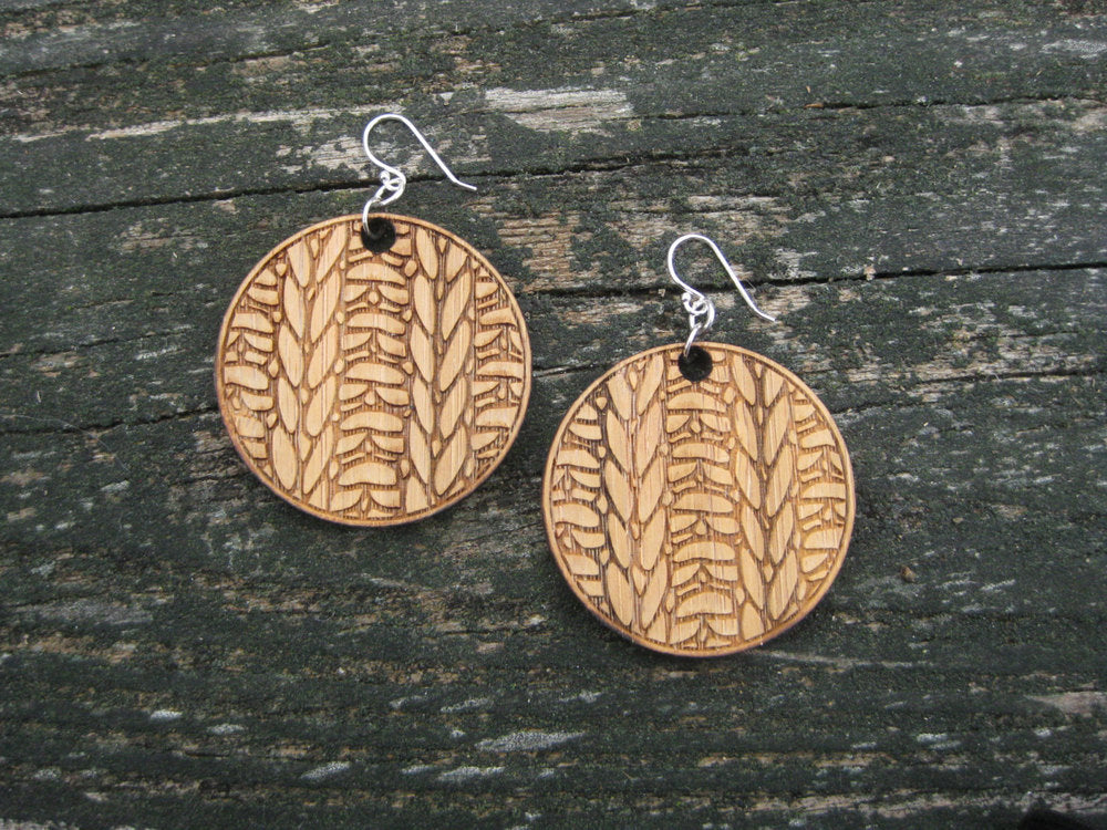 Wooden Knit earrings on sterling silver earwires. Size is 1.5". Each pair has the texture of a knit rib laser etched into the face.