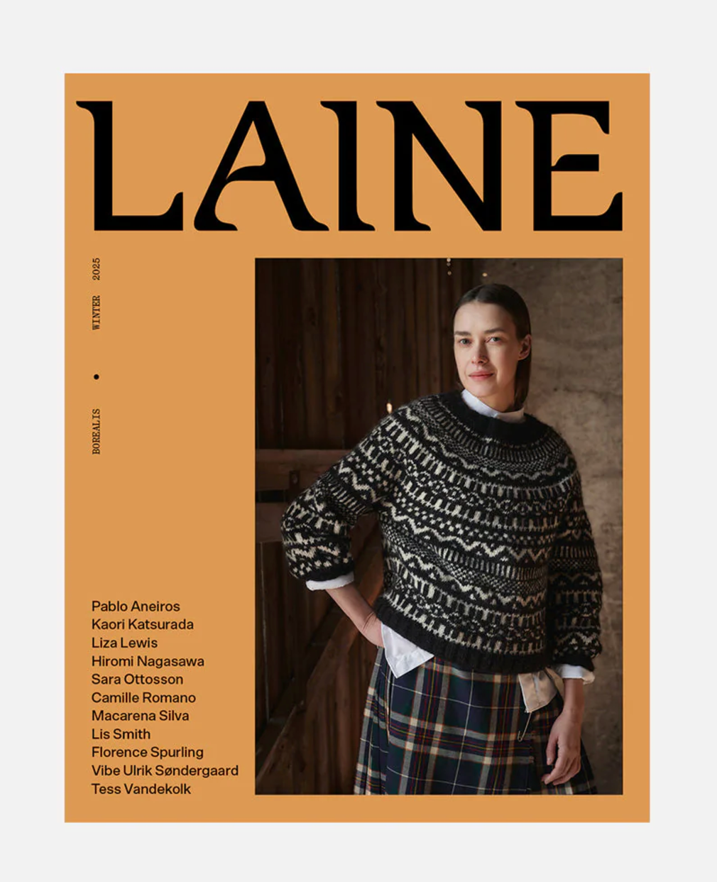Our winter issue, Laine 23, Borealis, takes you to the snowy countryside on one of the coldest days of the year. The warm, cosy and beautiful knits include many winter wardrobe staples, such as an all-over colourwork sweater, a cabled hat and a chunky, textured cardigan. The serene stillness captured in this edition’s photography soothes your mind and senses.