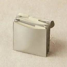 - Made of sturdy washable paper - Color: Kraft - Dimensions: 5.5” (14 cm) X 5.5” (14 cm) X 0.5" (1 cm) (when flat) - up to 5" (12.5 cm) deep, when expanded - 11 pockets (5 large, 2 medium, & 4 small) and 3 removable, tabbed folders - Top flap extends over the pockets, secured with a waxed cotton cord that winds around an all-natural corozo button - Stands upright on a flat surface when expanded for easy access to contents.