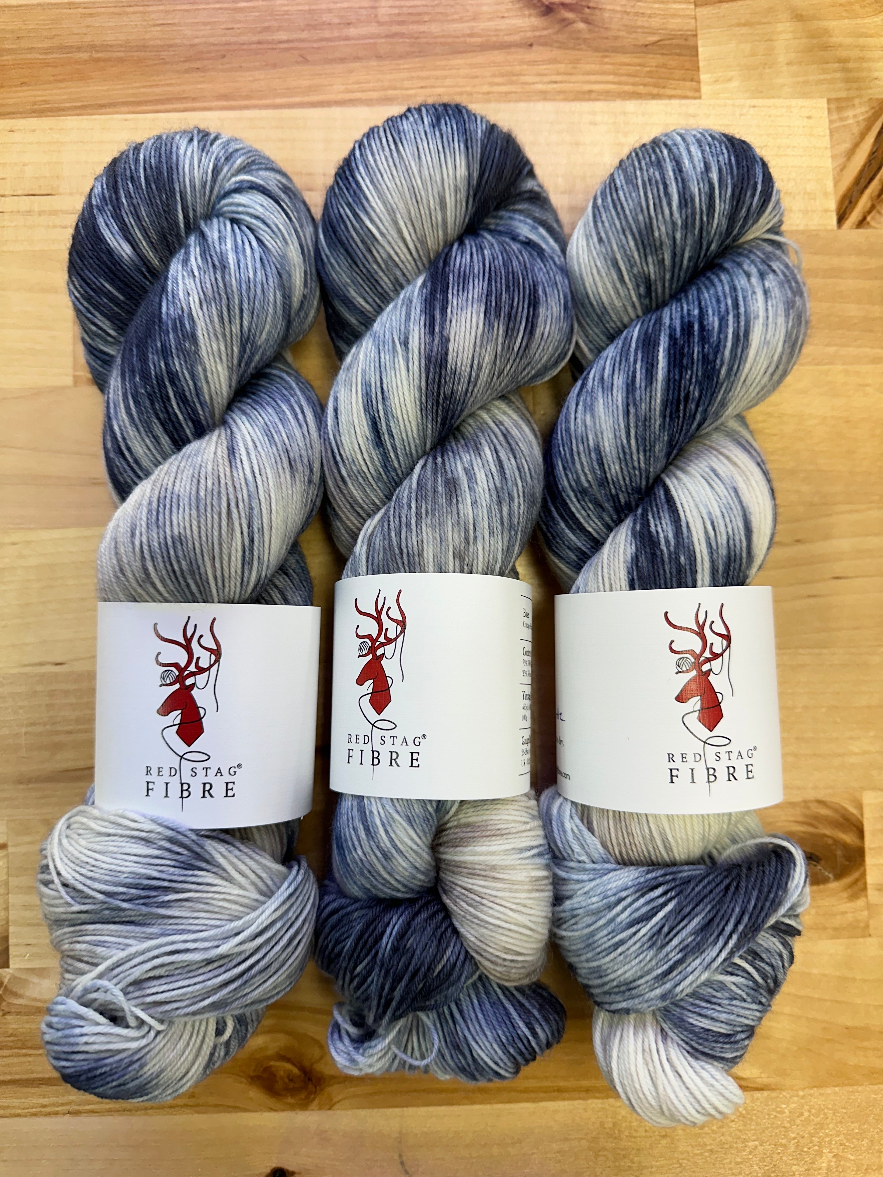 Our Very first custom colorway from Red Stag Fibre, Sharon's Palette! All the light neutrals plus blue that Sharon loves, all in one yummy skein!
