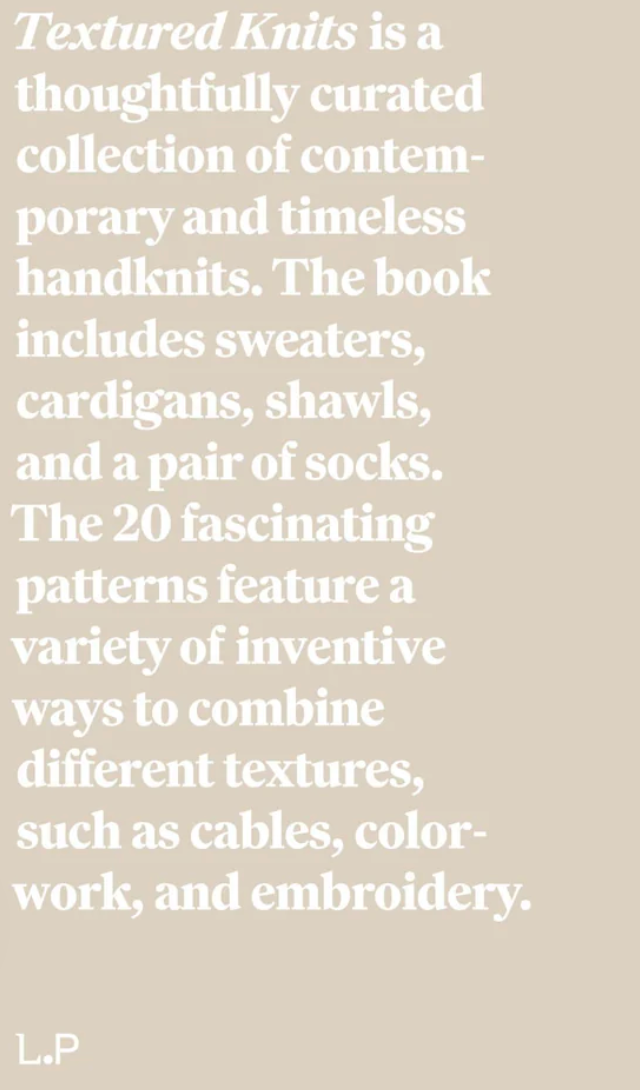 - 20 knitting patterns (14 sweaters, 3 cardigans, 1 pair of socks, and 2 shawls)