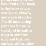 - 20 knitting patterns (14 sweaters, 3 cardigans, 1 pair of socks, and 2 shawls)
