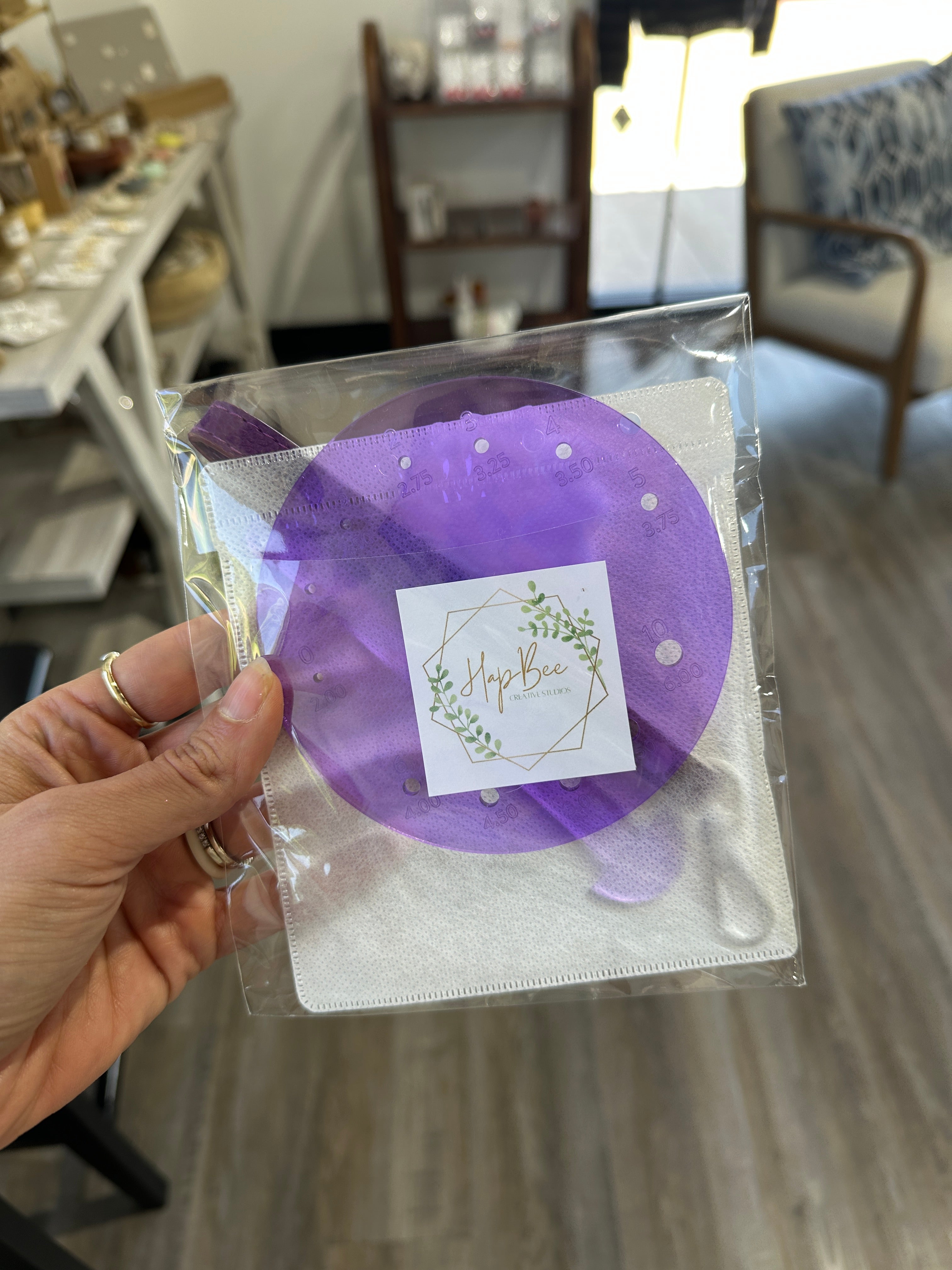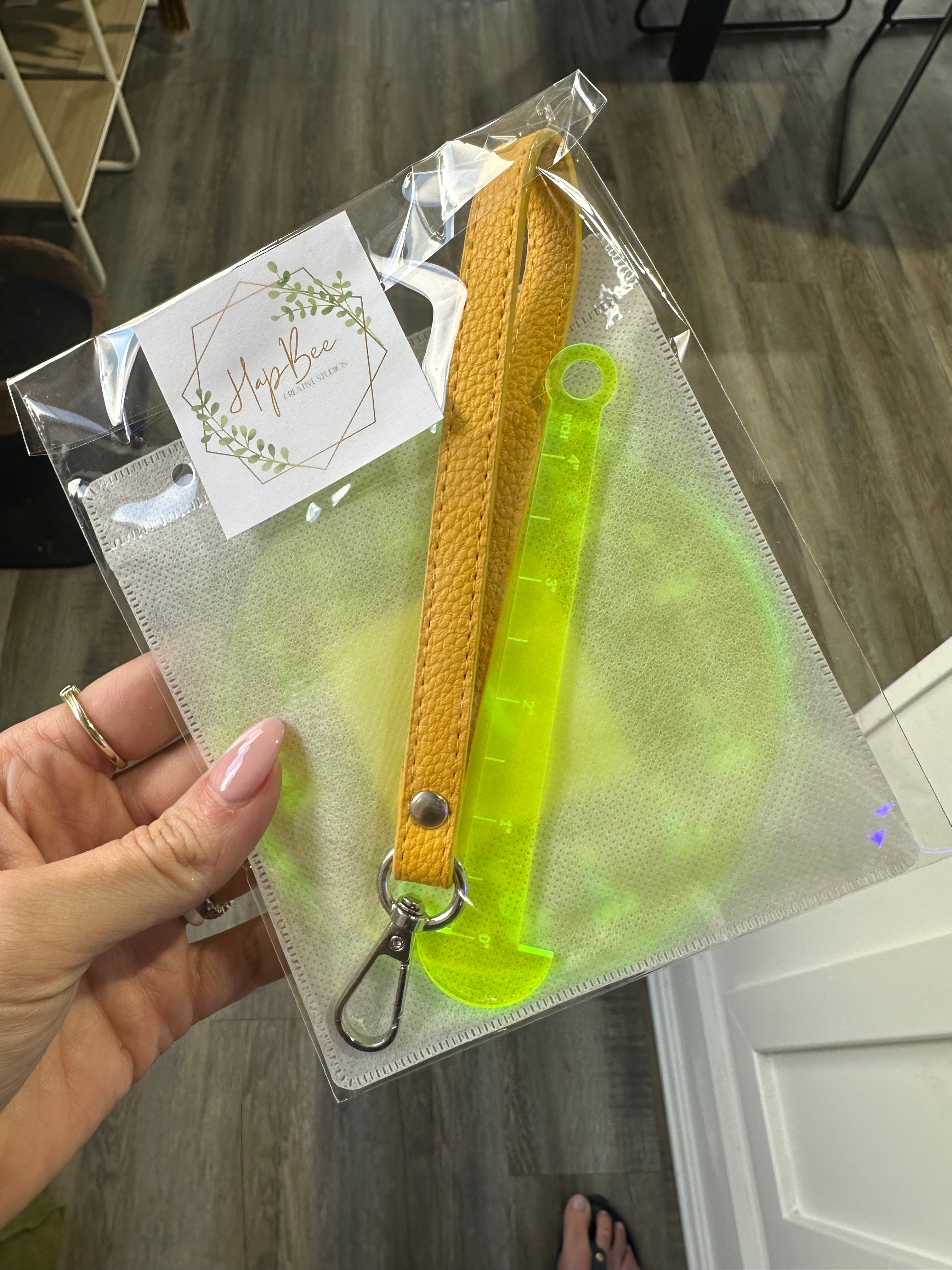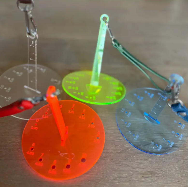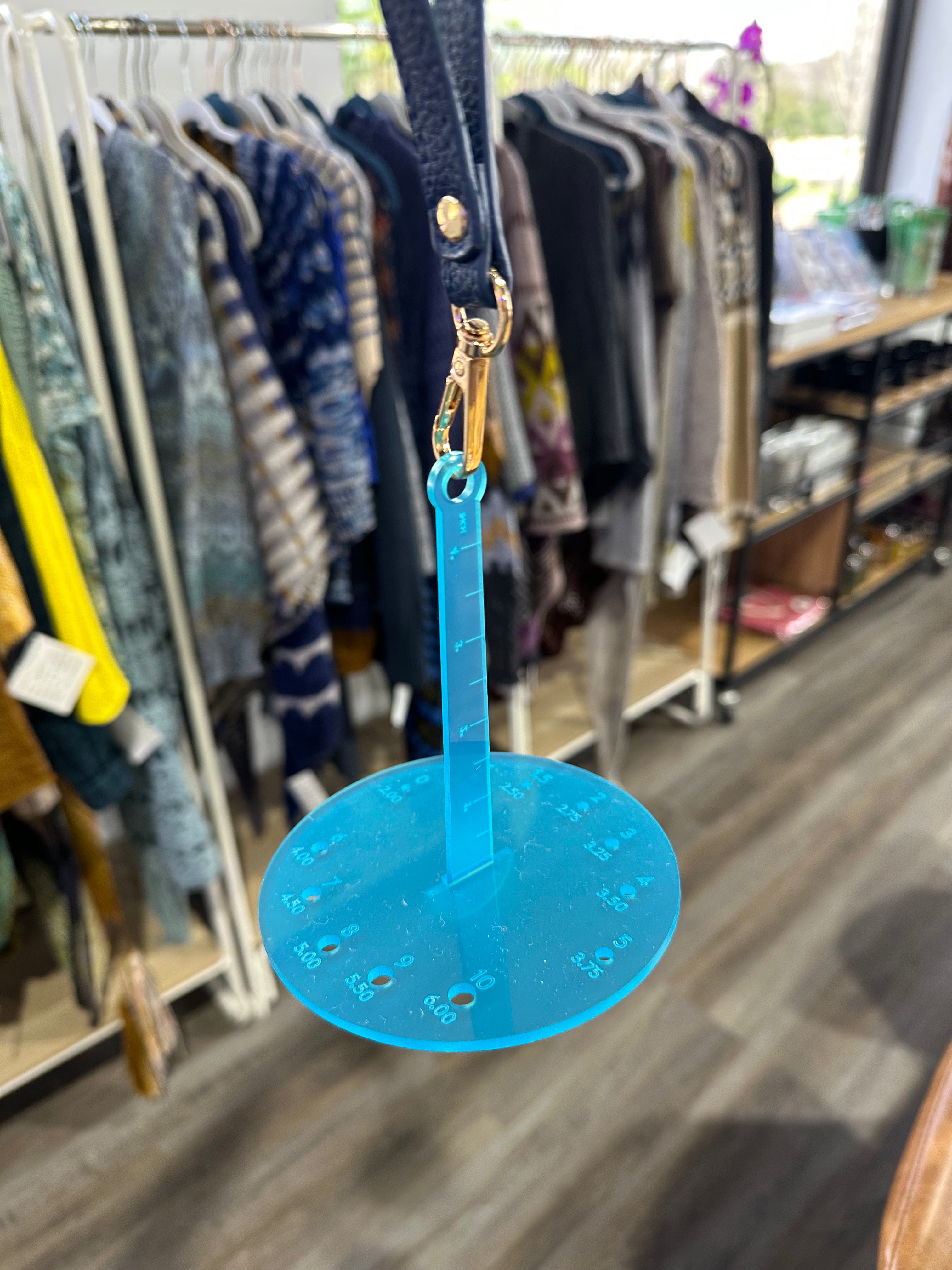 This handy tool does triple duty! A helpful yarn caddy/butler to keep yarn in place. Pop on the strap and away you go to your next adventure with your yarn always handy. The base is a helpful needle gauge, and the stem is a handy 4" T-Square. Packaged in its own storage sleeve (recycled CD cases).