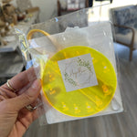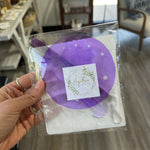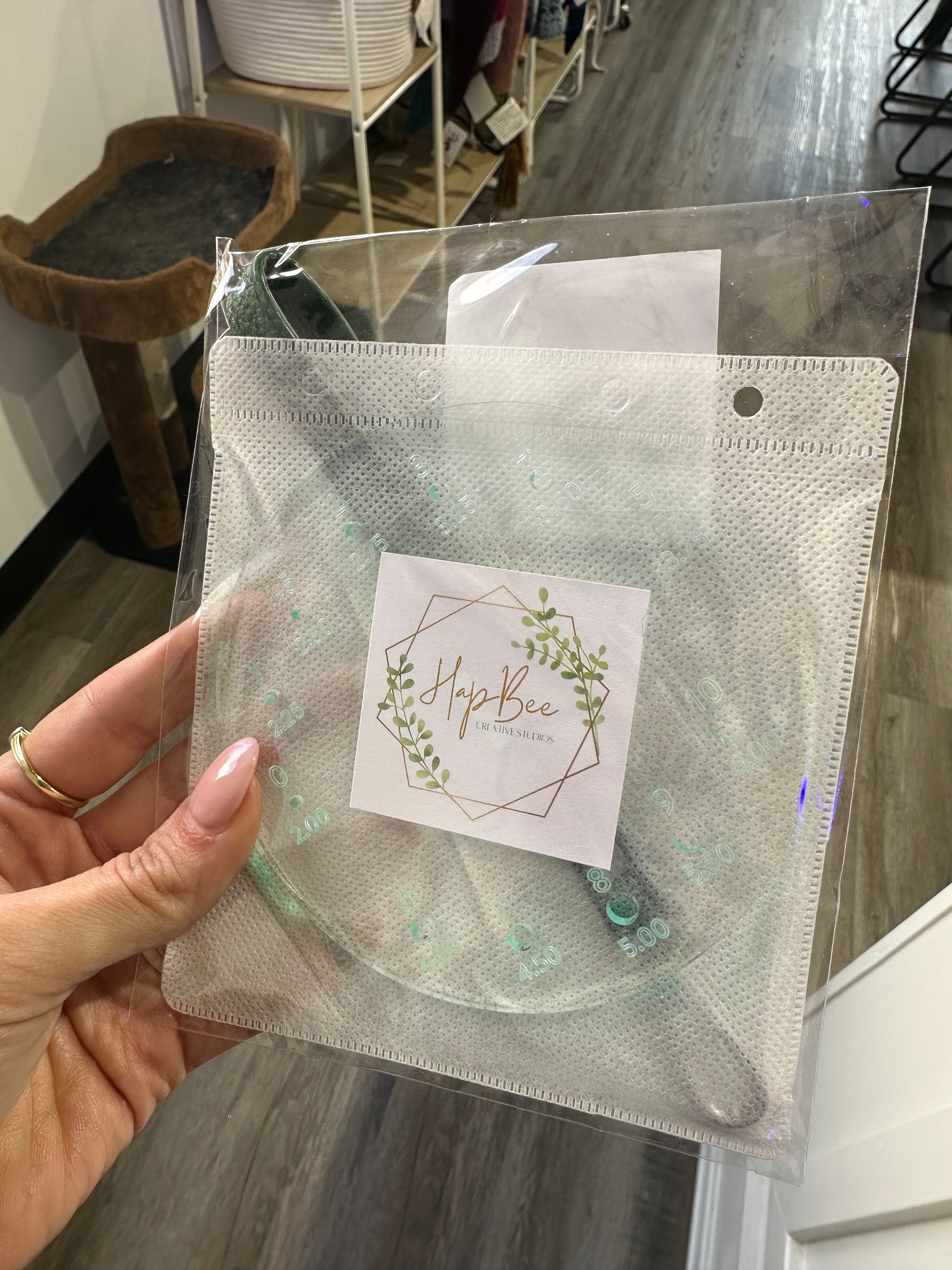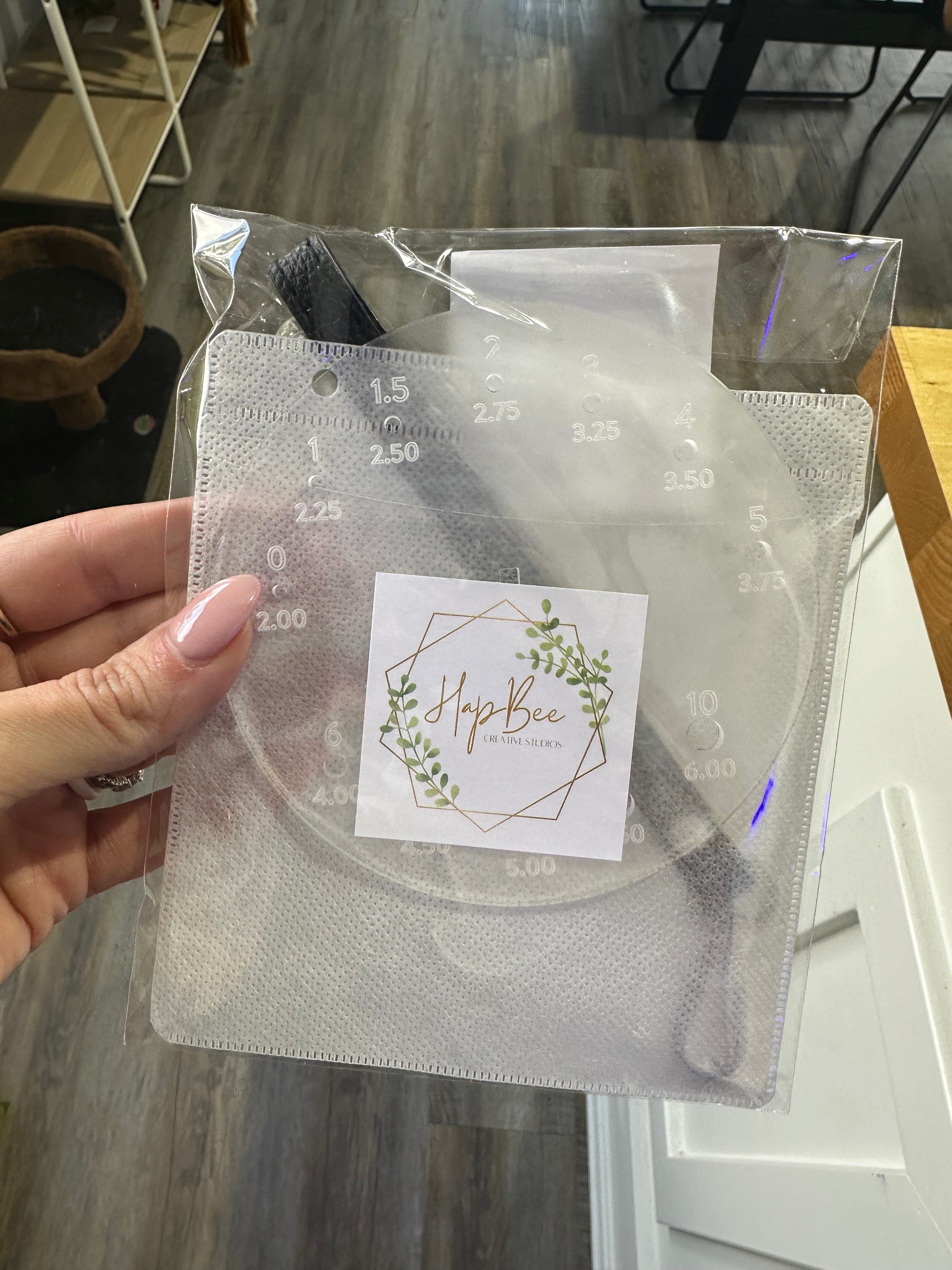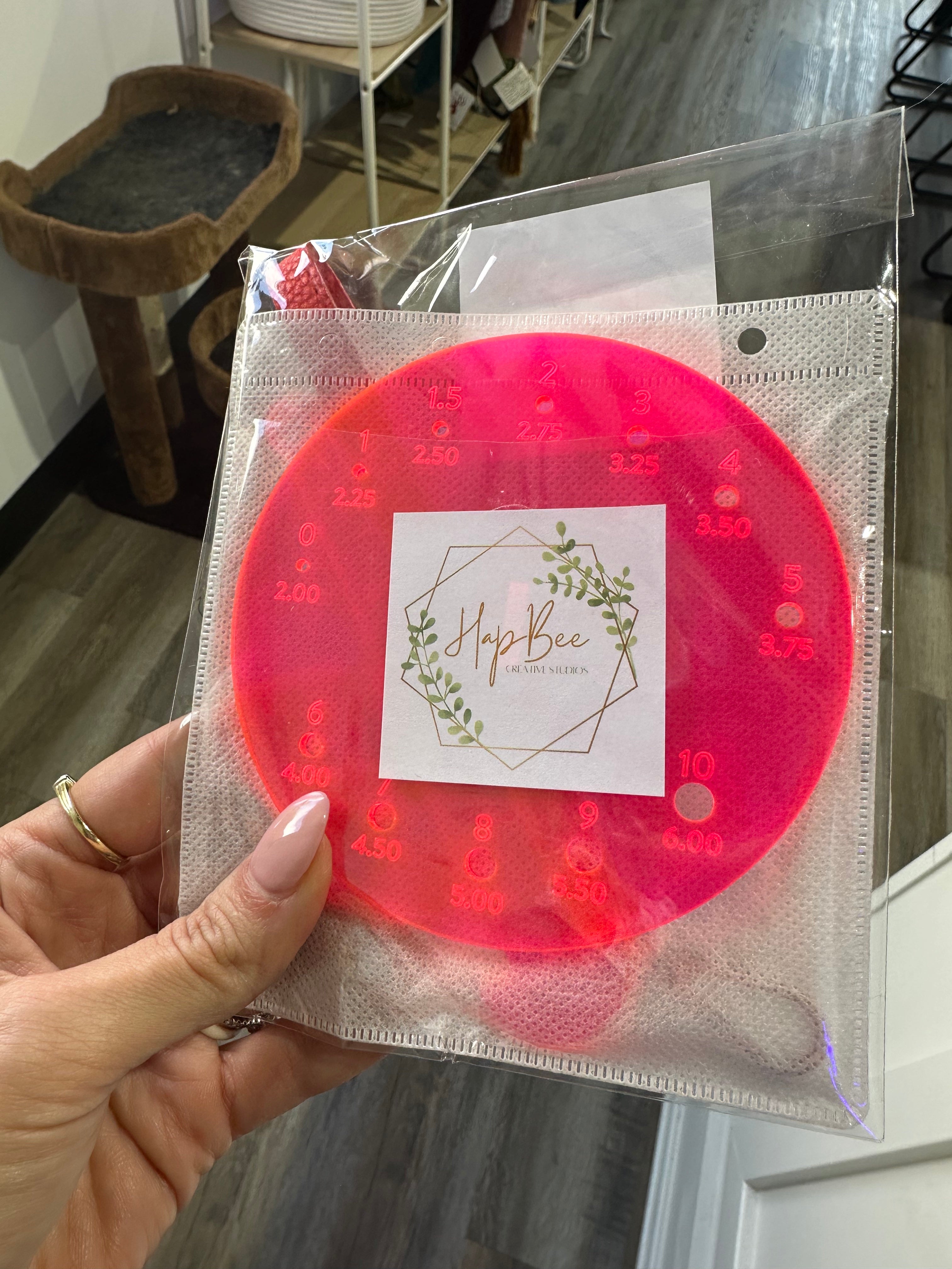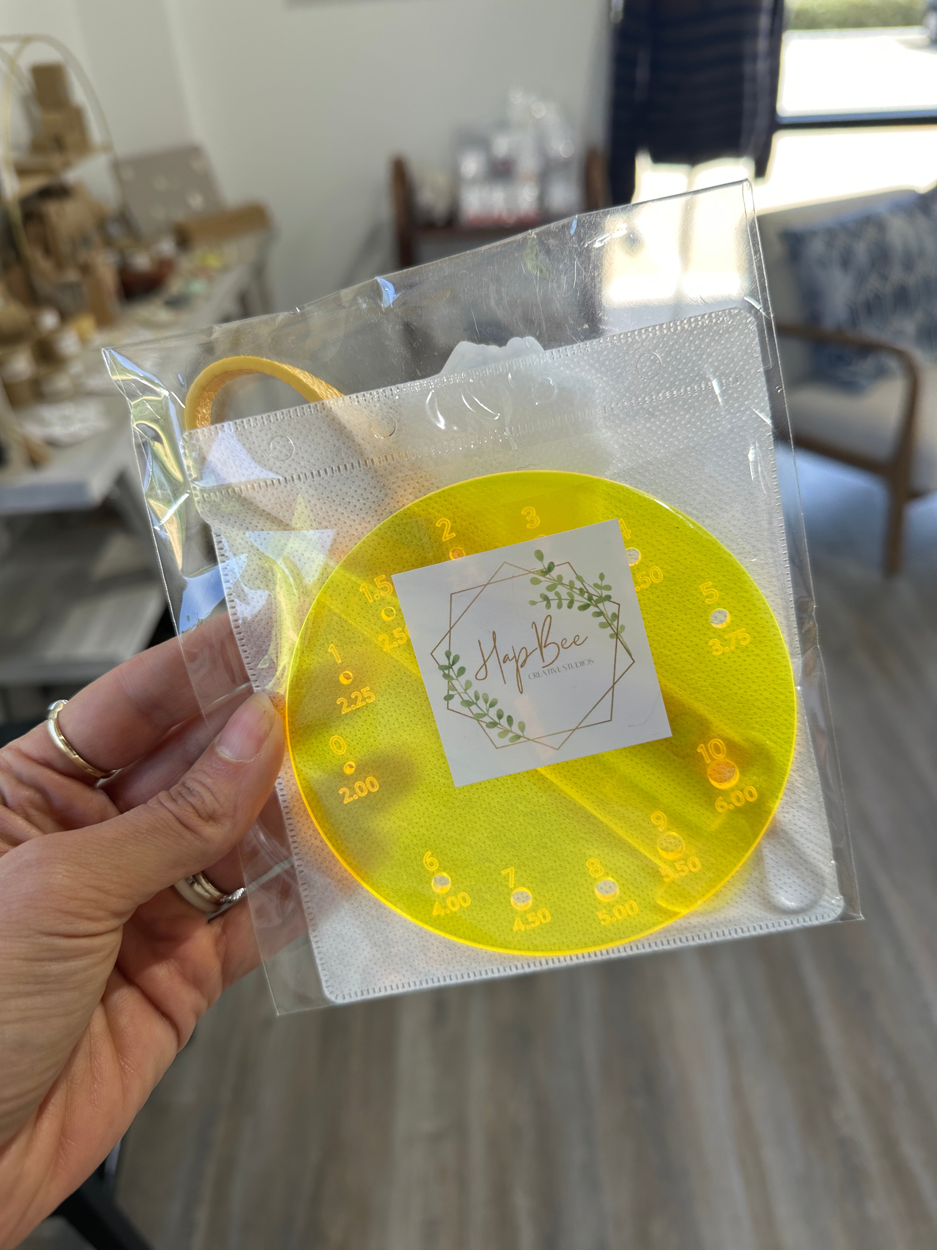 This handy tool does triple duty! A helpful yarn caddy/butler to keep yarn in place. Pop on the strap and away you go to your next adventure with your yarn always handy. The base is a helpful needle gauge, and the stem is a handy 4" T-Square. Packaged in its own storage sleeve (recycled CD cases).