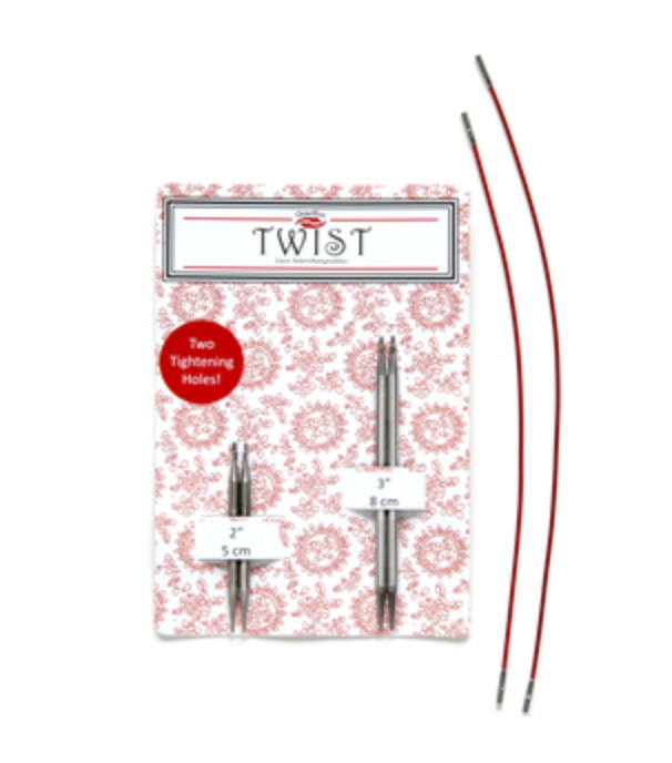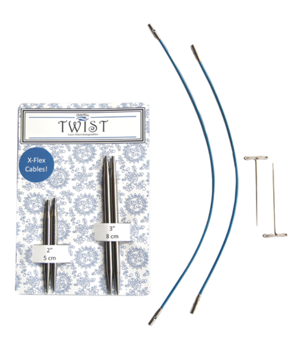 Our TWIST™ Short Combo packs contain one 2″ (5 cm) and one 3″ (8 cm) set of the same size tip as well as two cables allowing knitters to make 9″ (23 cm) – 12″ (31 cm) circulars.