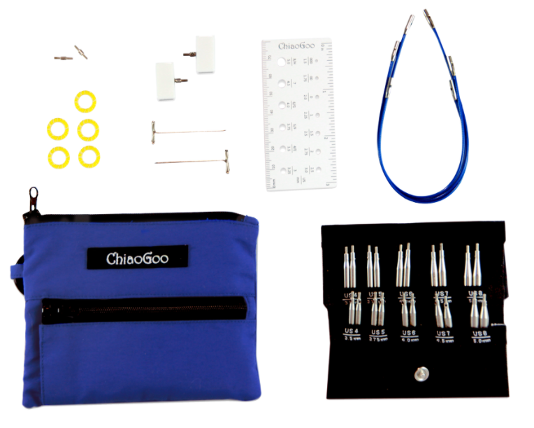 NEW! With our Blue Shorties set you can make 9″ (23 cm) through 14″ (36 cm) circulars. This set includes 10 sets of 2″ (5cm) solid stainless steel & 3″ (8cm) hollow stainless steel interchangeable tips from US4 – US8 (3.5 – 5mm). Also included is a secure tip sleeve, three [S] diameter blue X-Flex cables (5″/13cm, 6″/15cm & 8″/20cm), end stoppers, tightening keys, connectors, stitch markers and a mini needle gauge all in a blue, pocket-sized nylon fabric pouch. The 2″ (5cm) tips have a tightening hole to ensure you get a secure connection. Item #7230-S
